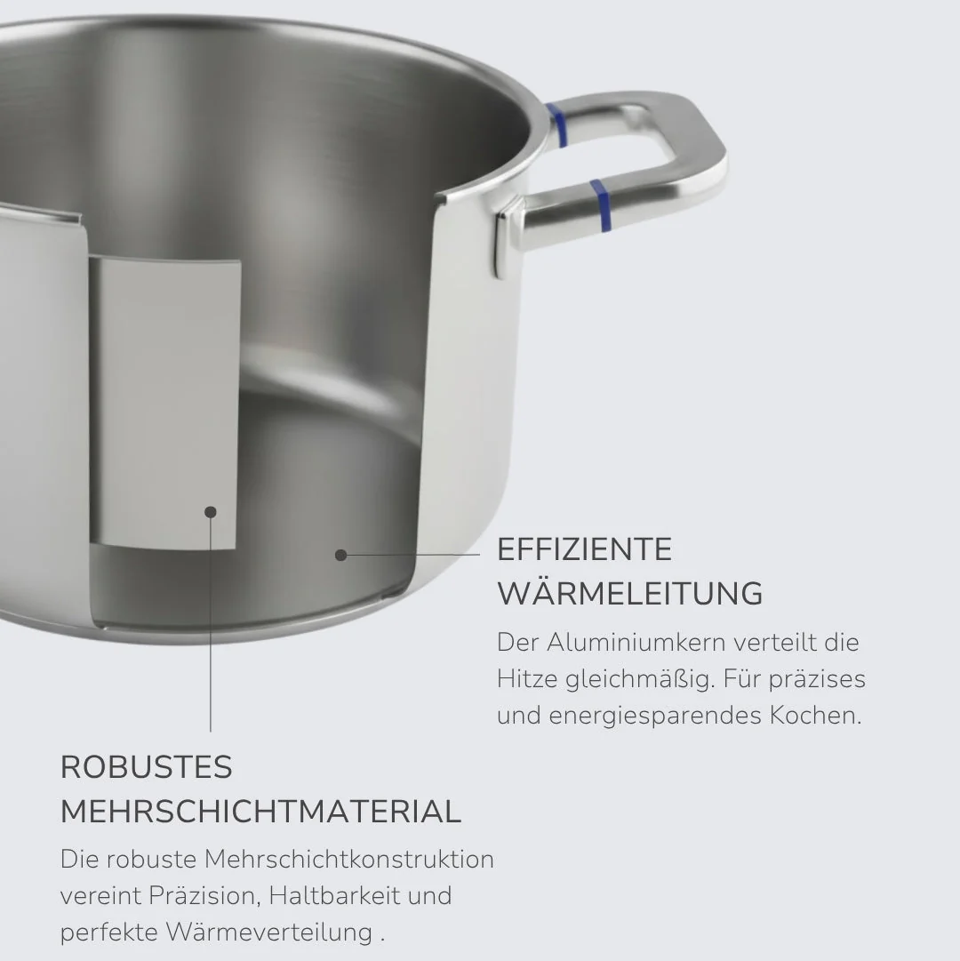 Mit dem Johann Lafer Gourmet Topfset, 4-tlg., inkl. 2 Deckeln holen Sie sich die perfekte Ausstattung für kulinarische Kreativität in Ihr Zuhause. Gefertigt aus besonders robustem, mehrschichtigem Material aus Edelstahl 18/10 mit einem Kern aus Aluminium, überzeugen die Kochtöpfe und die Bratpfanne durch exzellente Wärmeleitung sowie durch das nachhaltige Akkutherm Speichersystem, das Energie schnell aufnimmt, gleichmäßig verteilt und lange speichert – vom Boden bis zum Rand.